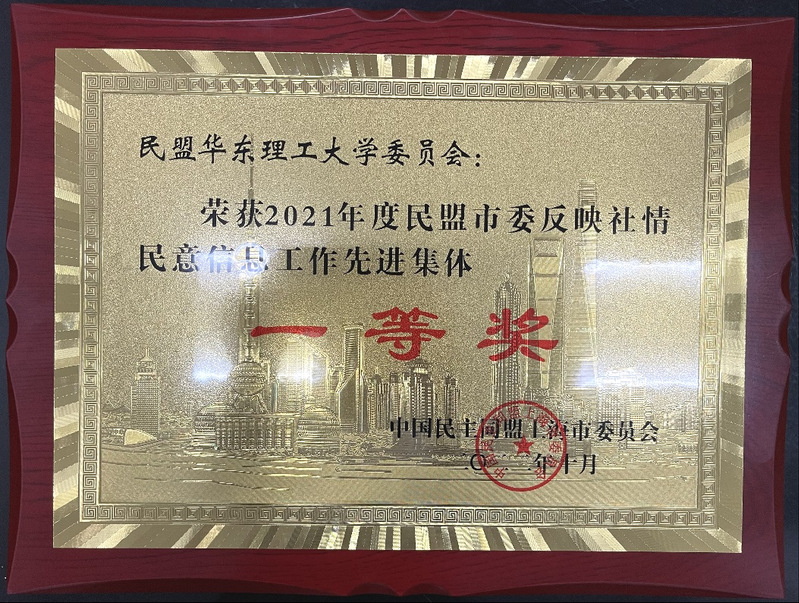 民盟华理委员会参政议政工作成绩突出,集体和个人均获表彰:民盟完美官方在线入口委员会被评为“2021年度民盟市委反映社情民意信息工作先进集体”一等奖;民盟华理委员会盟员安琦获“民盟上海市委2021年度反映社情民意信息工作模范个人”,民盟华理委员会委员林珩获“民盟上海市委2021年度反映社情民意信息工作积极分子”;安琦撰写的《高校教师评价考核方法现状、问题分析及对策建议》课题报告荣获民盟上海市委2021年度参政议政优秀课题。