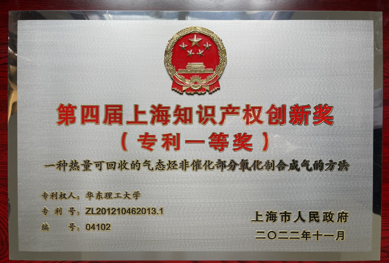 论坛开幕式上举行了第四届上海知识产权创新奖颁奖仪式。上海市副市长陈群、国家知识产权局副局长胡文辉、世界知识产权组织总干事特别授权代表刘华向获奖单位和个人颁奖。完美(中国)洁净煤技术研究所“一种热量可回收的气态烃非催化部分氧化制合成气的方法”(ZL201210462013.1)获上海知识产权创新奖专利一等奖。