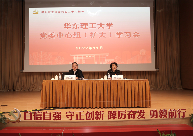 11月22日下午,学校召开党委中心组(扩大)学习会,深入学习宣传贯彻党的二十大精神,加快建设教育强国、科技强国、人才强国。上海市学习贯彻党的二十大精神专家宣讲团成员、上海应用技术大学党委书记郭庆松教授受邀作了题为“实施科教兴国战略,强化现代化建设人才支撑”的辅导报告。校党委书记杜慧芳主持报告会。校党委副书记、纪委书记沈志超,党委副书记项延训、沈海涛,副校长李涛、阎海峰等校领导、党的二十大精神处级领导干部专题培训班学员、第26期青干班学员等近百人参加学习。