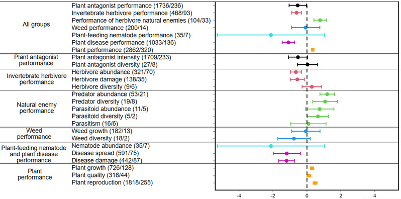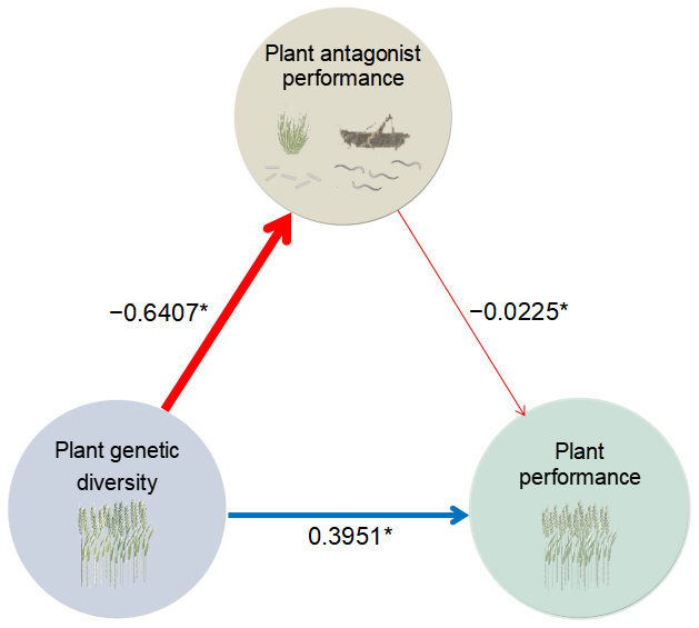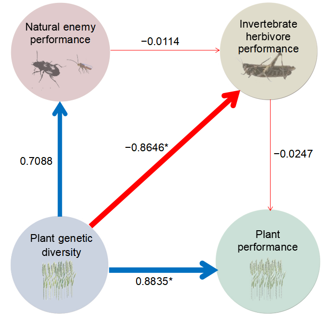 进一步利用结构方程模型量化各营养级功能群之间关系,结果显示:(1)在无天敌的作用下,植物基因多样性能够抵抗植物有害生物(病虫草害),使其危害降低,而植物有害生物下降促进了植物的生长发育与繁殖并增强了品质;(2)在植物、植食性昆虫、天敌共存的三营养级功能群中,多样化的植物基因有利于天敌,增强了天敌对害虫的控制效果,植物多样性通过提升天敌对害虫的控制能力来增强植物性状。
