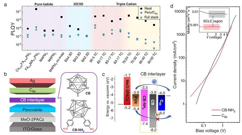 反式结构钙钛矿太阳能电池由于其更好的稳定性,更易于放大和集成等特点,被认为是最有望实现商业化的新一代光伏电池。然而,反式钙钛矿电池中的钙钛矿/C60界面存在严重的非辐射复合损失,限制了其单节及叠层器件效率的提升,亟需更高效的界面层或电子传输层来突破该瓶颈。为了解决这些复合损失,该工作引入了具有球状分子结构和三维芳香性的邻碳硼烷作为界面材料。通过荧光量子产率及导电AFM等测试,证实了苯胺基修饰的邻碳硼烷有效的钝化了钙钛矿表面,同时消除了钙钛矿/C60界面的非辐射复合损失。该工作同时研究了碳硼烷作为电子传输材料的潜力,在阻挡空穴的同时提升界面电子传输。通过此种策略,该工作实现了超过了23%的光电转换效率,以及低至110 mV的非辐射电压损失。器件在400小时最大功率点追踪下保持初始效率的97%。基于碳硼烷的界面层同时实现了钝化,电子传输和空穴阻挡,为更高效和稳定的反式钙钛矿太阳电池提供了新的界面功能材料。
