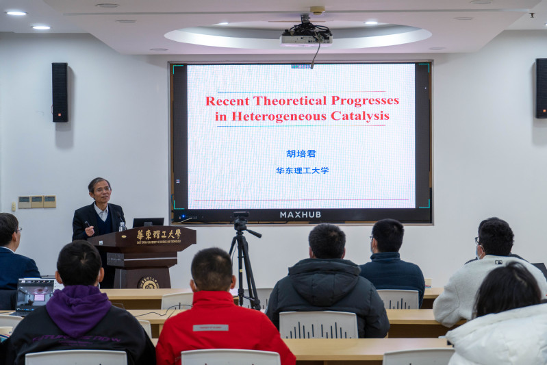 胡培君院士的报告从基于第一性原理的微观动力学模拟计算、非均相催化活性以及催化剂设计三个方面,介绍了他们团队在非均相催化基础理论和应用方面的先驱性工作。通过费托合成、酰胺加氢等典型反应案例,介绍了如何将催化基础理论、模拟计算方法应用于催化剂设计的创新性研究历程。报告引起了师生的热烈讨论,胡院士就电催化表界面理论、密度泛函理论模拟计算技术和宏观微观动力学跨尺度方法论等师生关心的热点问题逐一进行了解答,并以自身求学经历为例,勉励大家要勇立潮头,敢为人先,不断开展前沿性研究,为化工学院高质量发展注入创新活力。