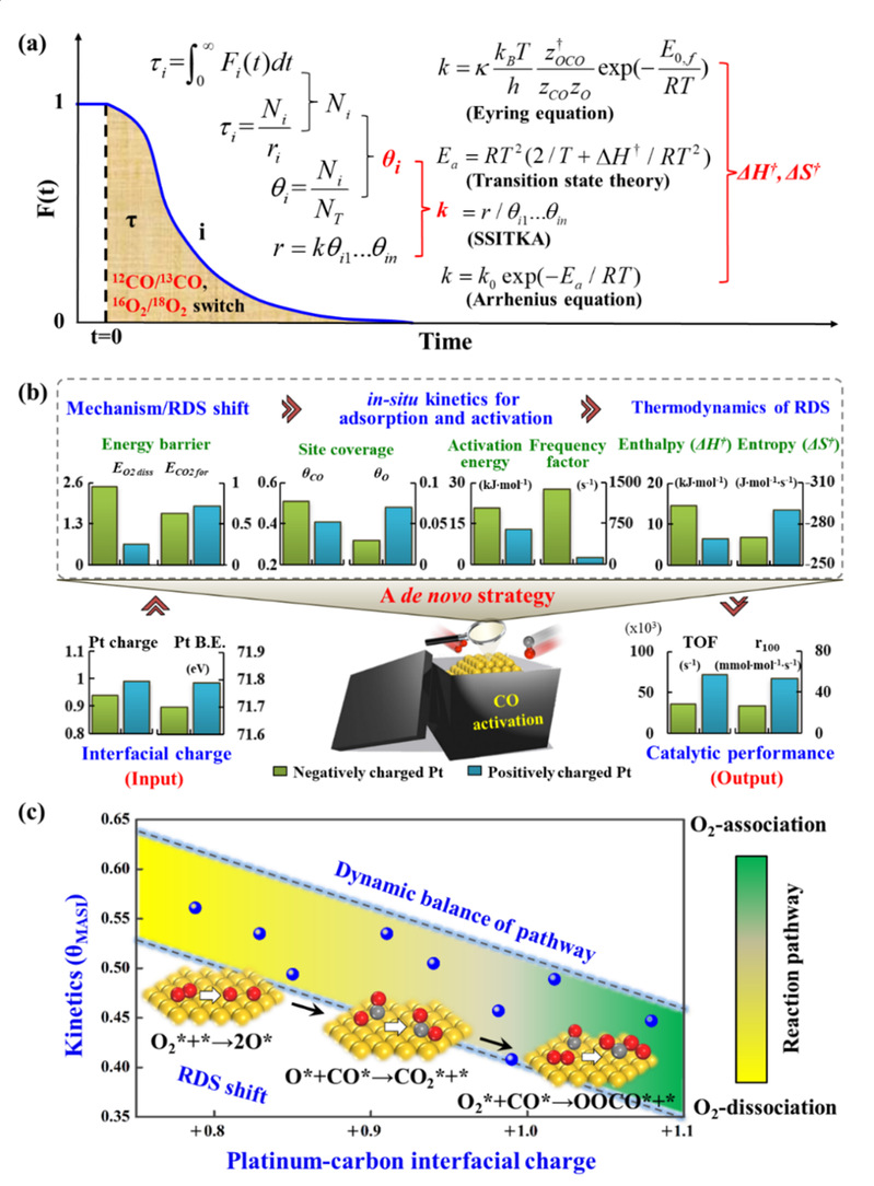 论文一方面创新发展了催化反应速率解析的方法,采用原位光谱/动力学分析与多尺度模拟相结合的研究手段,实现基于动力学分析的催化剂活性位与催化描述符辨认。另一方面,提出了“自下而上”的电子效应研究策略(图2),定量关联了“金属-载体表界面相互作用-反应机理-速率决速步的动力学与热力学信息-催化性能”之间的关系,从分子层面阐明了金属-载体间的电子相互作用根源及其对催化动力学行为及反应机理的调控机制,实现了高活性和选择性的催化剂设计开发。