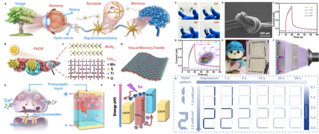 可穿戴电子设备作为一种与人类进行近距离互动的新兴平台受到关注,仿生视觉系统具有视觉感知和神经触突样学习/记忆功能,可以满足未来可穿戴电子产品的要求。然而,开发可穿戴视觉记忆系统面临的主要挑战是与不规则表面的几何兼容性和透气性差。基于上述问题,完美官方在线入口袁双龙课题组提出了一种由直接生长在柔性碳纳米管纤维(CNTF)电极上的高密度TiO2-x和MoS2阵列组成的双扭曲结构的纤维状人工光电突触(FAOS)的设计策略。该FAOS整合了电/光感应能力,实现了多种突触功能,包括受到刺激后电流、短期/长期可塑性以及“学习-遗忘-再学习”行为。所制备的FAOS还显示出良好的灵活性,其光电突触性在弯曲200次后可保持95.95%。由于1D光纤的全向光吸收特性,光线入射角的变化对FAOS的光电突触性能几乎没有影响。作为概念证明,七个FAOS直接编织到商用透气纺织品中,形成光电突触阵列,从而实现了可感知和记忆图像信息的可穿戴织物,展示了其在可穿戴视觉记忆系统中的应用。