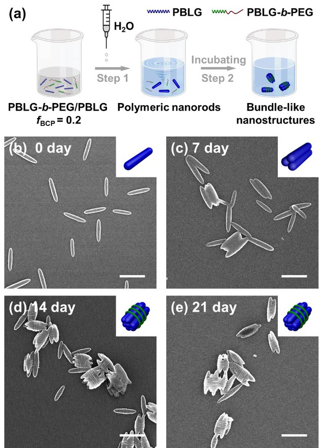 近日,完美(中国)材料学院林嘉平教授团队报道了嵌段共聚物介导的聚合物纳米棒超分子聚合。在聚合物纳米棒水溶液中,加入嵌段共聚物第二组分,可以调控超分子反应,发生新颖的“肩并肩”并排聚合现象,并形成独特的捆绑束状多级结构。疏水刚性的聚(γ-苄基L-谷氨酸酯)(PBLG)均聚物在含水的有机溶剂中自组装形成纳米棒,PBLG的主链与纳米棒的长轴方向平行;由于其表面的疏水性,纳米棒发生无序聚集,形成不规则的结构。当体系中加入聚(γ-苄基L-谷氨酸酯)-嵌段-聚乙二醇(PBLG-b-PEG)嵌段共聚物时,纳米棒仍能形成,但是其无序聚集行为被抑制;通过静置培养,纳米棒“肩并肩”聚合形成束状有序结构。随着束状聚集体的形成,嵌段共聚物在其表面逐渐组装形成纳米螺纹,纳米棒的聚合终止,最终得到捆绑束状多级结构的聚合产物。
