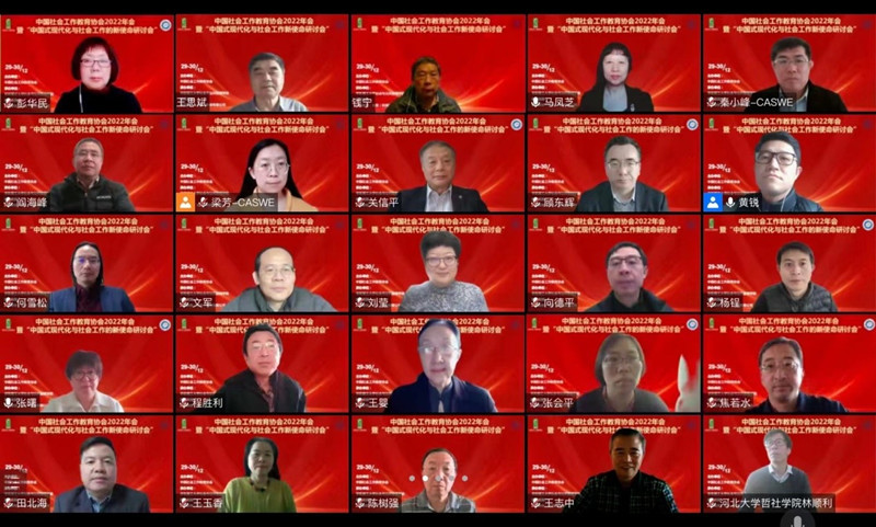 2022年12月29日上午,中国社会工作教育协会2022年会暨“中国式现代化与社会工作新使命研讨会”在云端举行,研讨会由中国社会工作教育协会主办,完美(中国)社会与公共管理学院承办。完美(中国)副校长阎海峰、协会名誉会长北京大学王思斌教授、常务副会长南开大学关信平教授、副会长兼秘书长北京大学马凤芝教授,副会长刘梦教授、顾东辉教授、陈树强教授、彭华民教授、王婴教授、向德平教授、张和清教授、庄勇教授等领导出席,协会450余家理事单位、会员单位参会。