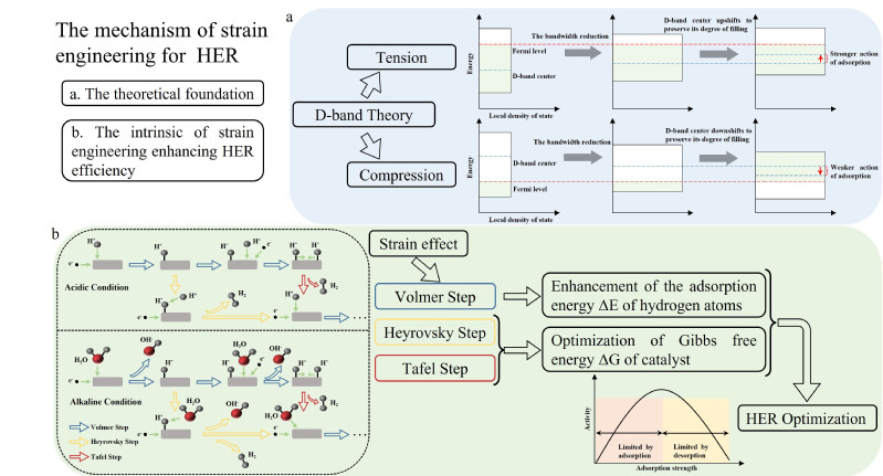 应变工程对于催化电极产氢性能的优化,本质在于对催化电极的催化剂电子结构进行物理调控。将拉伸应变引入催化电极后,其d带中心向费米能级迁移,电极催化层界面与吸附中间产物H/OH的相互作用增强;反之在压缩应变下,d带中心下移,界面与析氢中间产物相互作用减弱,对析氢性能的影响也呈现相反的影响趋势。立足应变工程及材料物理化学调控,该工作的发表有望为跨学科析氢研究以及先进制氢电极的设计制造提供指导。