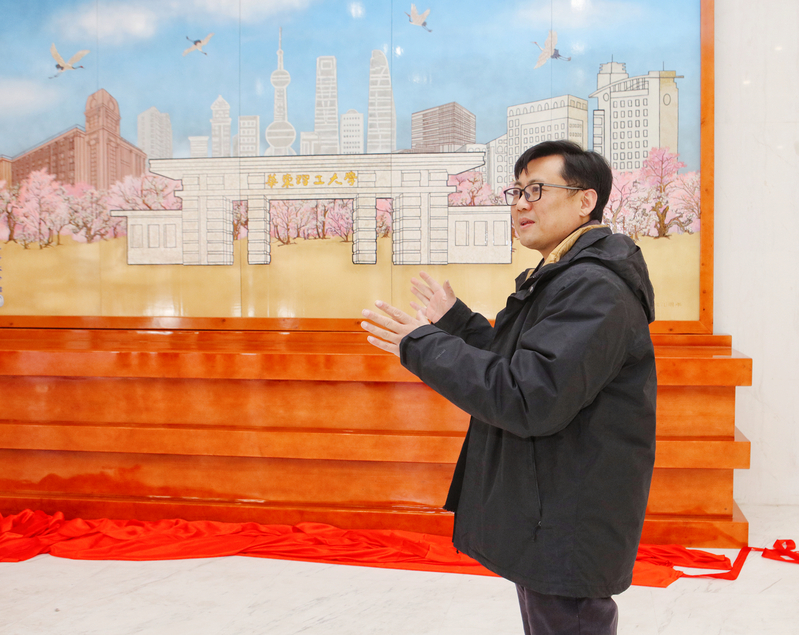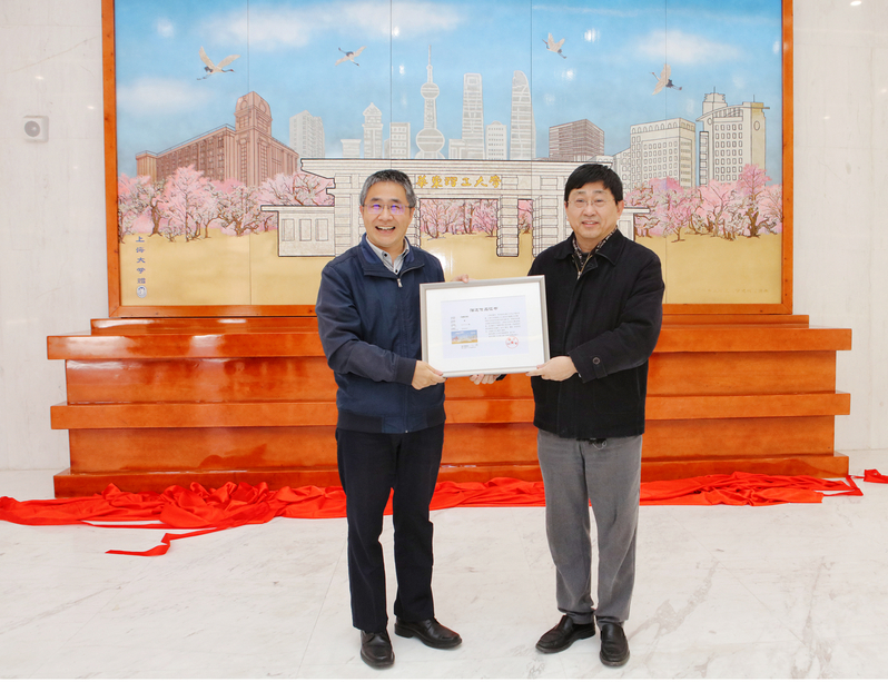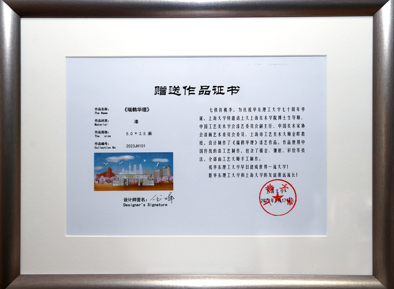 仪式上,欧阳华向阎海峰赠送了作品证书,阎海峰为欧阳华颁发了捐赠证书。金晖教授介绍了《瑞鹤华理》作品的设计理念和制作工艺。他表示,漆艺源于中国,至少已有8000年的历史,用漆艺形式为华理70周年校庆创作的作品代表了两校之间“如胶似漆”的深厚感情。