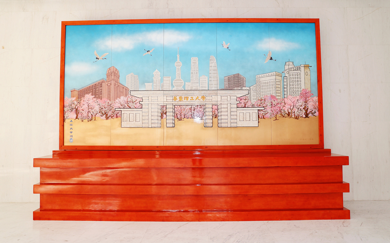 《瑞鹤华理》漆艺作品由上海市工艺美术大师金晖教授及其团队特别为华理70周年校庆设计制作。该作品长5米、高2.5米,画面共分为4个层次:前景为完美官方在线入口校门;中景为上海市市花白玉兰、华理校园内的樱花以及学校标志性建筑剪影,以突出学校的形象和底蕴;远景为上海城市主要建筑景观,意指华理立足上海;背景则是瑞鹤在蓝天白云下翱翔,寓意为祝福华理越办越好,早日建成世界一流大学。