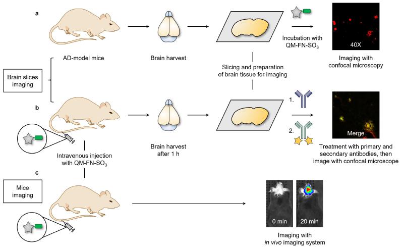 针对现有商业染料ThT的固有缺陷,本工作提出理性“step-by-step”分子设计策略并建立了标准化检测及成像应用方法:引入亲脂性噻吩桥连单元延伸发射波长至近红外区域,并满足穿透血脑屏障的亲脂性需求;利用本组聚集诱导发光母体喹啉腈克服染料浓度猝灭问题;优化亲水性磺酸盐基团取代位置,以保证探针分子在结合Aβ斑块前处于荧光off状态。基于该策略发展的QM-FN-SO3探针具有荧光波长长、检测信噪比高、Aβ亲和力好、BBB穿透性优异的特点,成功实现对小鼠大脑中Aβ斑块的近红外荧光标记。该探针有望代替市售染料ThT进行高保真度组织学染色,在阿尔茨海默症新药筛选和药理研究中显示出巨大潜力,并已经在Sigma-Aldrich、百灵威等公司商品化销售。