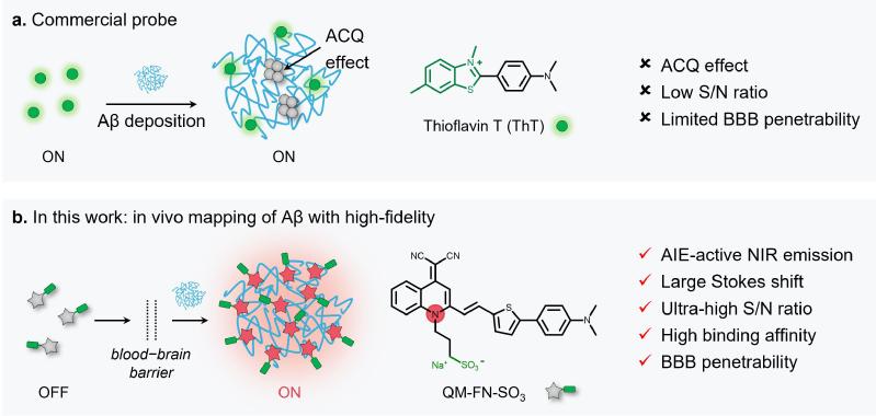 神经退行性疾病与蛋白质错误折叠和病理积累息息相关。其中,阿尔茨海默症(AD)是一种起病隐匿的神经系统退行性疾病,也是痴呆症最常见的病症类型。值得注意的是,Aβ斑块积累是阿尔茨海默症最为显著的病理特征,因此开发可视化的荧光探针检测Aβ斑块对阿尔茨海默症的早期诊断至关重要。半个世纪以来,硫黄素衍生物(ThT或ThS)作为检测Aβ斑块的“金标准”染料,已被广泛用于AD大脑组织切片染色。然而,这类染料具有浓度猝灭、信噪比低和血脑屏障(BBB)穿透性差等显著缺陷,难以对Aβ斑块进行活体成像检测。特别是如何克服染料延伸波长的亲脂性需求与实现Aβ点亮型检测之间的矛盾是目前亟待解决的科学问题。