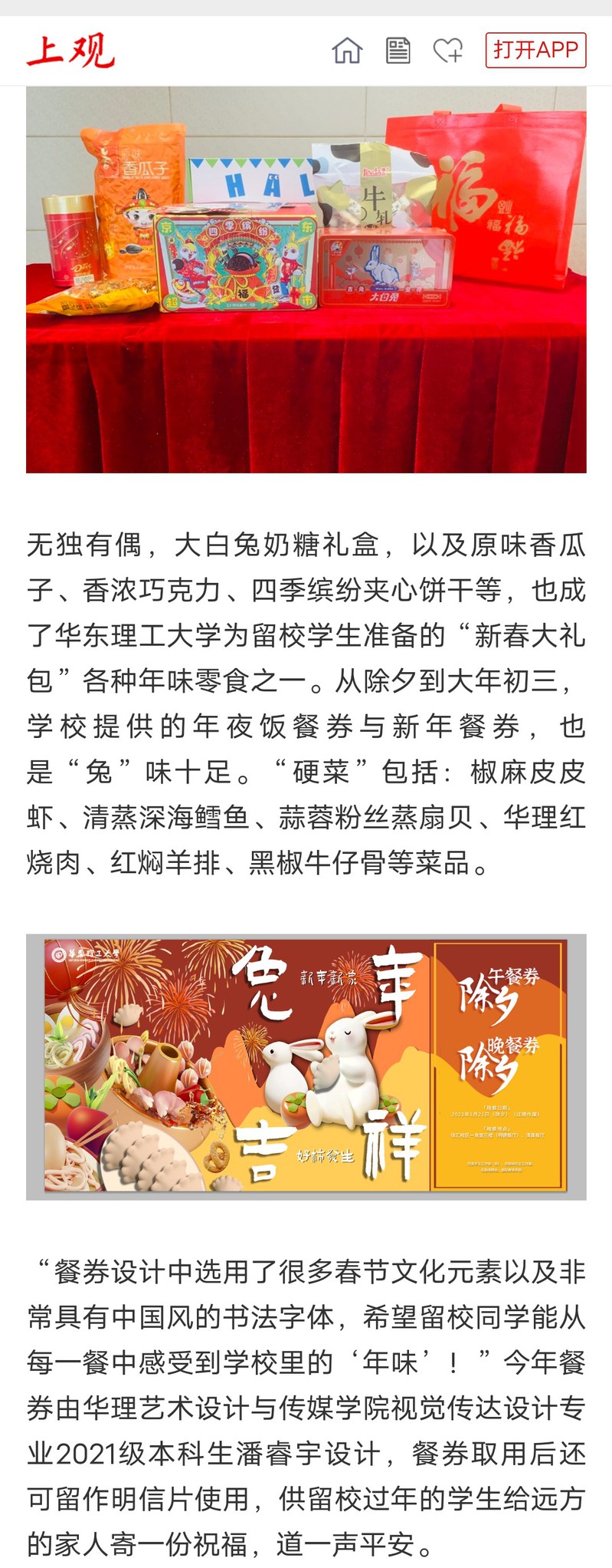 “餐券设计中选用了很多春节文化元素以及非常具有中国风的书法字体,希望留校同学能从每一餐中感受到学校里的‘年味’!”潘睿宇说。