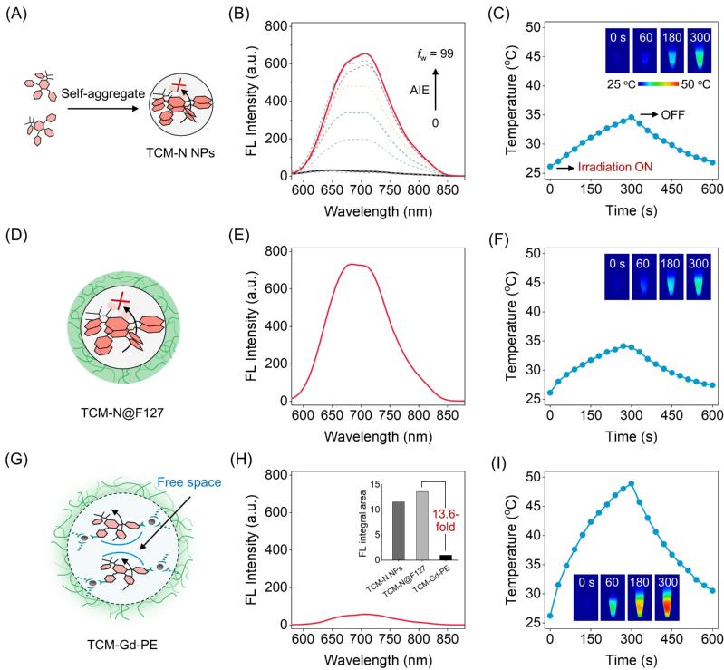 在纳米诊疗体系中,如何基于限域环境精准调控分子运动和相互作用仍面临着极大的挑战。例如,以疏水作用力驱动的组装方式是构筑纳米体系最为广泛的手段(如疏水性分子的自组装、双亲性的嵌段共聚物包裹)。然而,该种策略会使得纳米体系产生“疏水的墙”和“致密的核”,从而导致难以在其内部操纵分子行为。近年来,将光热治疗(PTT)与磁共振成像(MRI)集成在纳米诊疗体系中,对实现个性化诊疗具有重要临床应用价值。值得注意的是,现有纳米体系的限域环境严重抑制了具有光热性能染料的激发态分子内运动,进而极大地限制了其光热性能;此外,“疏水的墙”会阻碍其与水质子间的相互作用,显著地降低产生MRI信号的强度。因此,如何从分子设计策略出发,构建兼具高性能PTT和MRI功能的纳米诊疗体系具有重要的研究意义,亦面临着重大的挑战。