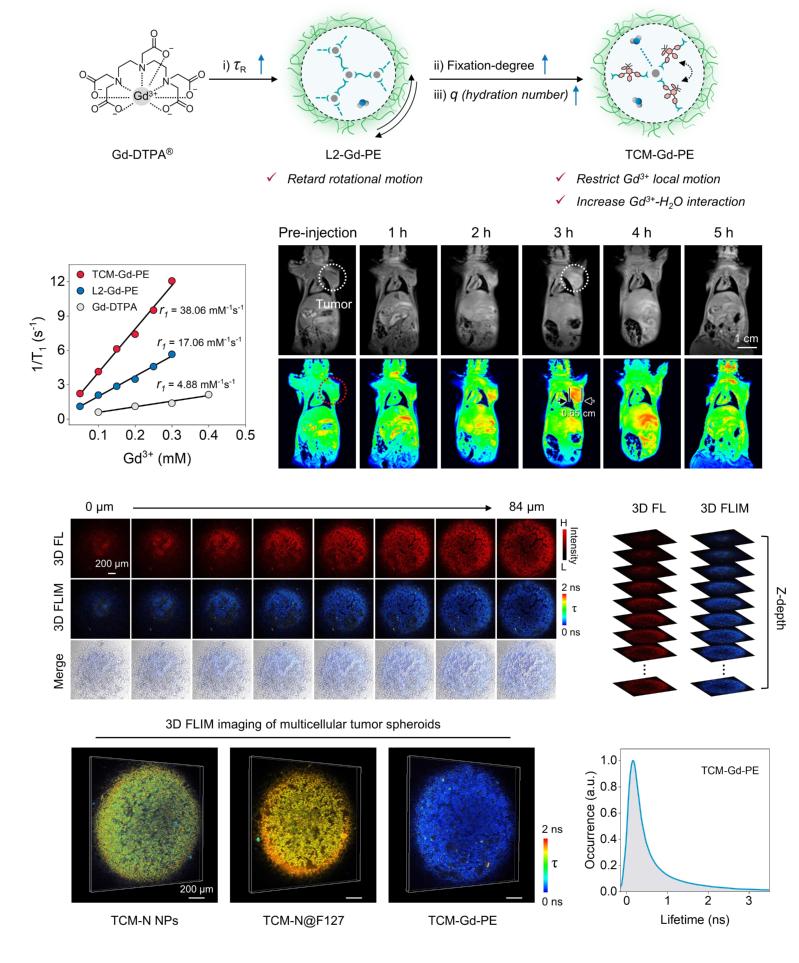 图3. APN纳米探针MR弛豫率增强机制;MRI引导的高效光热治疗;多细胞肿瘤球三维荧光寿命(3D-FLIM)成像