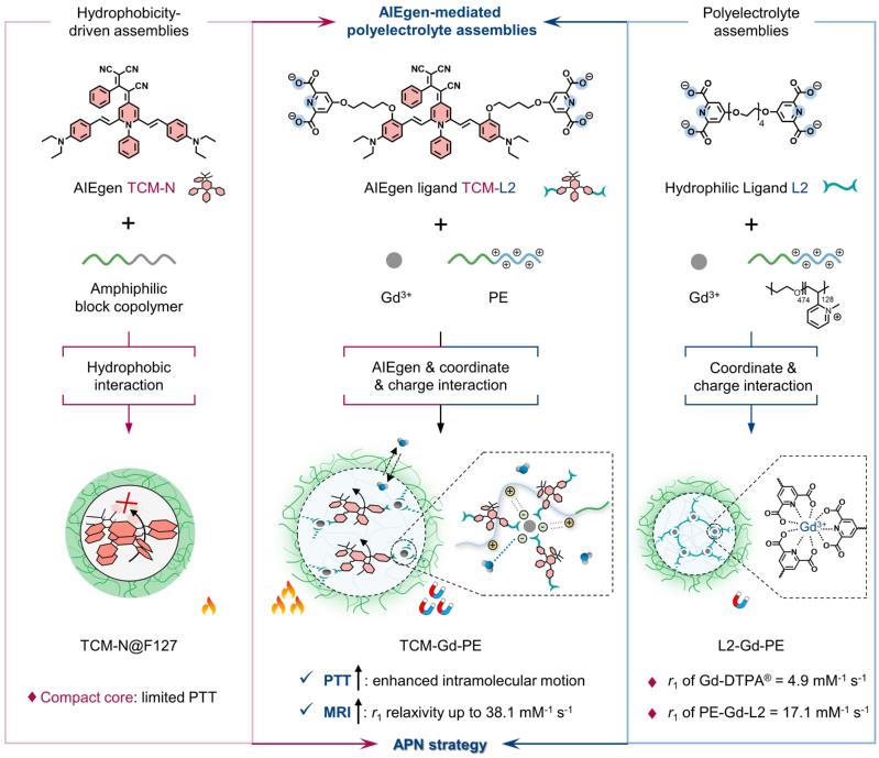 近日,化学与分子工程学院郭志前教授课题组报道了一种基于AIE染料构建的聚电解质组装体新策略(AIEgen-Mediated Polyelectrolyte Assemblies,APN策略)。在APN策略中,以聚集诱导发光染料(AIEgen)配体(TCM-L2)、磁成像金属离子(Gd3+)和聚阳离子-中性嵌段共聚物(P2MVP128-b-PEO474)为构筑单元,通过金属配位作用和离子的相互作用,三组分在水溶液中可迅速组装为尺寸均一的纳米聚集体(TCM-Gd-PE)。该APN设计策略具有普适性,可用于构筑系列金属离子、多种嵌段共聚物的聚电解质纳米体系。与疏水作用力驱动的纳米体系截然不同,基于APN策略所获得的组装体具有特殊的“柔软”、水相的内部微环境,在纳米的限域环境中实现了精准操控分子内运动和MR弛豫率协同增强(图1),相关研究成果以“Fluorescent Probes Based on AIEgen-Mediated Polyelectrolyte Assemblies for Manipulating Intramolecular Motion and Magnetic Relaxivity”为题发表于《德国应用化学》,并被选为VIP(very important paper)论文。