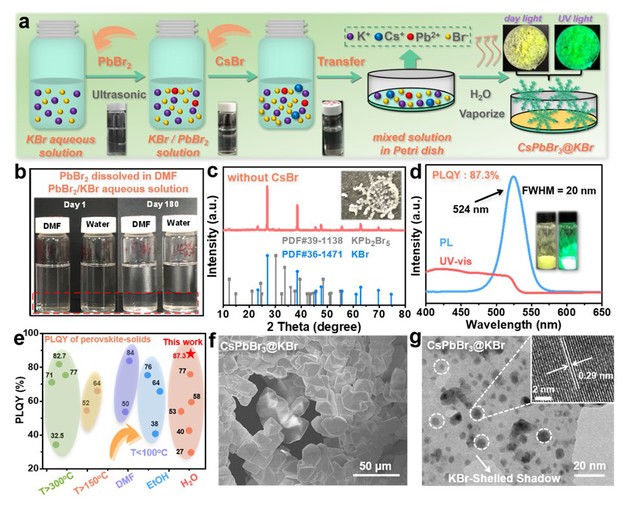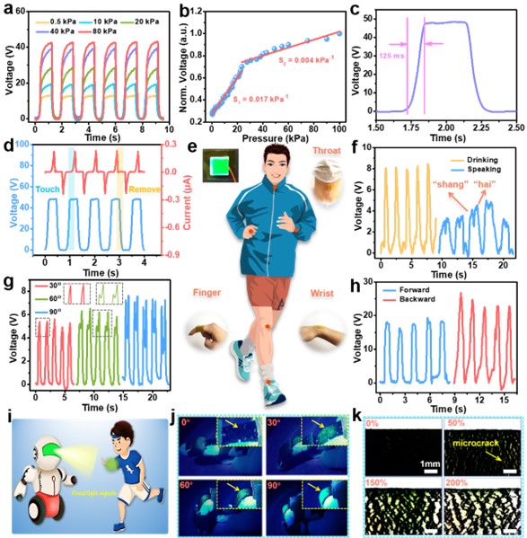 可穿戴电子设备近几年发展迅速,其目标是轻量化、小型化和高度集成。作为可穿戴电子设备之一的可穿戴表皮传感器的趋势是迅速将输出的生理信号转换为易于读取或可视化的信号,或在单个平台上集成光栅传感和显示功能,从而满足可穿戴交互设备中不断增长的“屏幕中的传感器”需求,作为其能量来源之一的摩擦纳米发电机(TENG)因高瞬时功率输出、多功能性、低成本和易于制造而受到极大关注。在TENG中,盐类通常作为添加剂来提高输出性能,而钙钛矿纳米晶由于高发光效率近几年成为研究热点。基于此,完美官方在线入口袁双龙课题组创新性地提出一种非常简便的水蒸发结晶策略来制备CsPbBr3@KBr固体添加剂,其具有狭窄的半高峰宽、高量子产率以及优异的光照射和热稳定性。在高效发光实现实时显示的同时提高了TENG输出效率,将其与PVA结合作为TENG正极摩擦材料时,其输出性能提高了2.3倍,基于此构建了响应时间为125 ms和响应范围为0-100 kPa的可穿戴传感器用作人体实时运动监测,扩展了钙钛矿基材料的应用领域,并显示了其在自供电的可穿戴传感器领域的巨大前景。