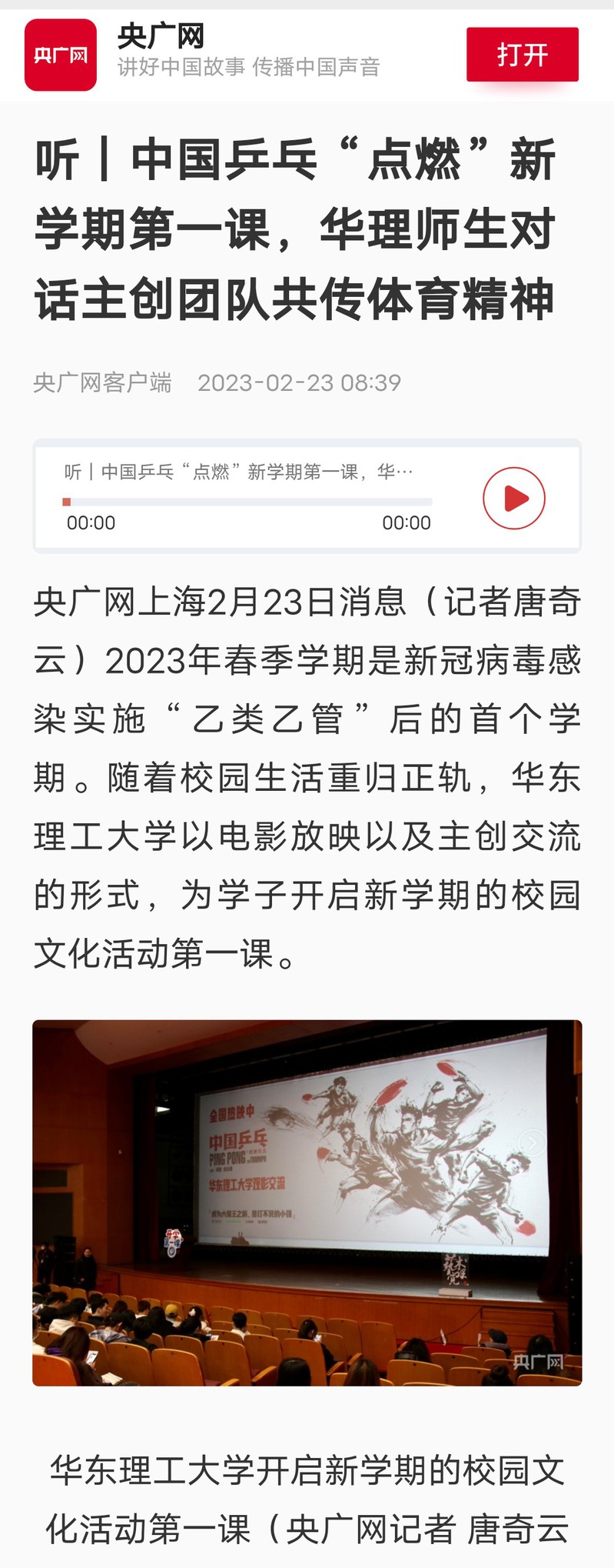【央广网】听|中国乒乓“点燃”新学期第一课,华理师生对话主创团队共传体育精神