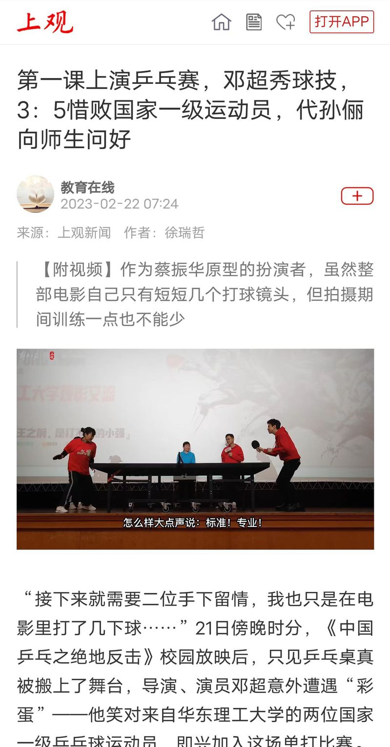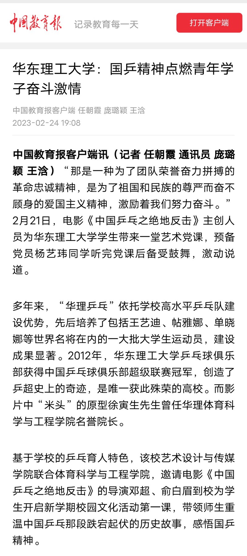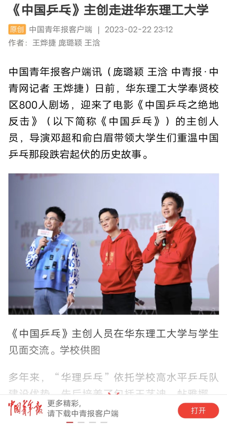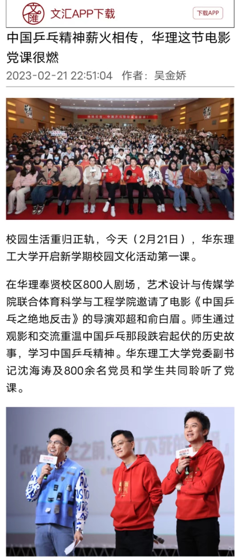 2月21日,基于完美(中国)乒乓育人的特色,电影《中国乒乓之绝地反击》主创人员受邀带来一堂艺术党课。导演邓超和俞白眉与华理师生共同重温中国乒乓那段跌宕起伏的历史故事,感悟国乒魅力,传承国乒精神。800余名师生参与了这别开生面的开学第一课。中央广播电视总台、中国教育报客户端、中国青年报客户端、央广网、上观新闻、中国新闻网、澎湃新闻、文汇APP、新民APP、青春上海、东方网、劳动观察、上海电视台、上海教育电视台、上海科技报、上海热线、上海教育新闻网、第一教育、话匣子等近20家媒体对此进行了报道。本篇选取了部分报道予以转载。