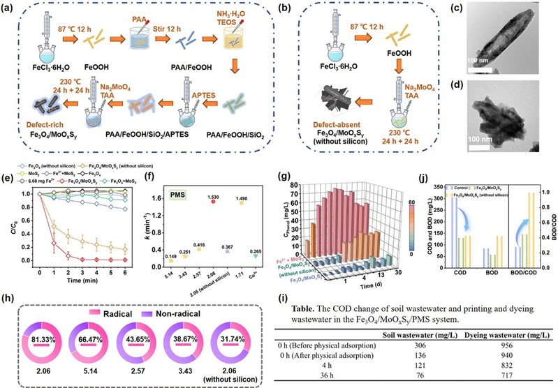 然而,精准设计类芬顿催化剂活性位点和开发具有可调控的催化氧化途径是目前的研究难点。为解决上述难题,邢明阳教授团队通过引入缺陷和调节催化剂表面的Mo4+/Mo6+比例,在Fe3O4/MoOxSy活化过一硫酸氢盐(PMS)降解苯酚的体系中实现了自由基和非自由基反应途径的切换。采用分步热还原法制备了Fe3O4/MoOxSy类芬顿催化剂(表面包硅修饰,图a;不包硅修饰,图b),并在微观形貌(包硅,图c;不包硅,图d)、晶体结构、化学性质、催化活性(图e)等方面将两种催化剂进行了比较。包硅操作会破坏Fe3O4和MoOxSy的表面晶格,引入表面缺陷。丰富的缺陷电子使得催化剂表面暴露更多的Mo4+,进一步促进了PMS活化分解产生自由基,最大反应k值可达1.530 min-1(图f),且还能实现对苯酚长达30天的长效降解(图g)。实验证实包硅改性可使得自由基反应历程主导降解苯酚的贡献率达到81.33%(图h)。同时,改变钼铁比会提高催化剂表面暴露Mo6+的比例。Mo6+有助于产生1O2,因此,随着Mo6+占比的提高可实现从自由基向非自由基反应历程的切换,且非自由基主导的降解苯酚的贡献率可达68.26%(图h)。自由基反应历程主导的类芬顿体系可实现对实际有机废水化学需氧量(COD)的高效去除(图i);而非自由基反应历程主导的体系则可显著提高废水的可生化性(BOD/COD = 0.997)(图j)。Fe3O4/MoOxSy/PMS类芬顿体系中自由基与非自由基反应历程的切换,拓展了高级氧化技术在废水处理中的靶向应用。