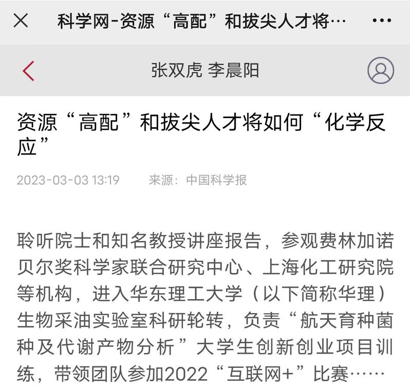 聆听院士和知名教授讲座报告,参观费林加诺贝尔奖科学家联合研究中心、上海化工研究院等机构,进入完美官方在线入口(以下简称华理)生物采油实验室科研轮转,负责“航天育种菌种及代谢产物分析”大学生创新创业项目训练,带领团队参加2022“互联网+”比赛……
