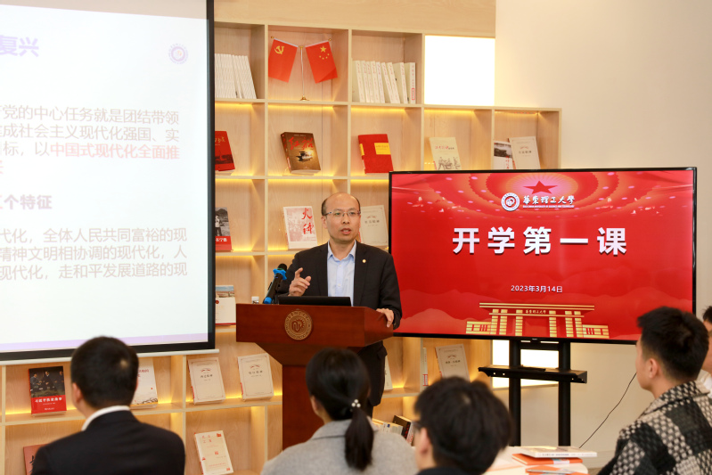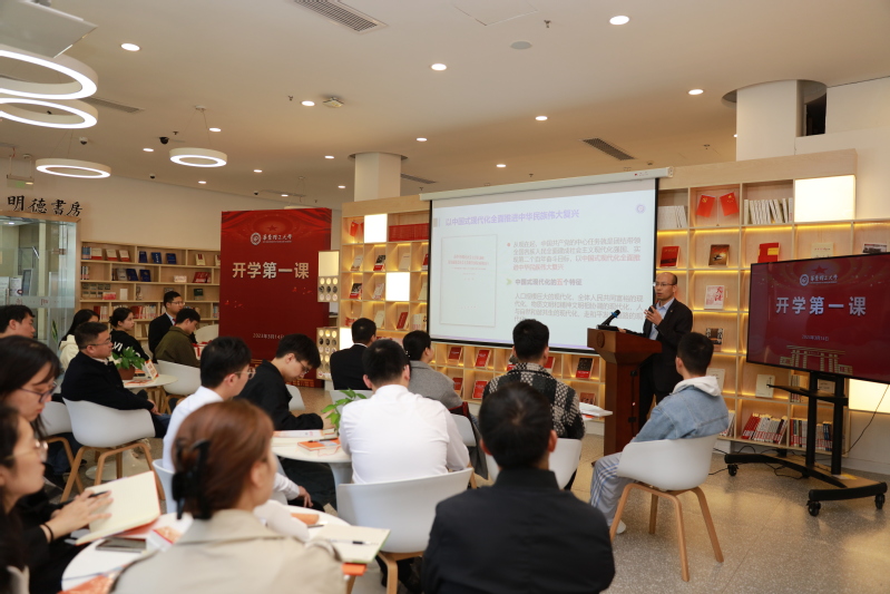 本次“开学第一课”在徐汇校区图书馆明德书房举行,主题为“以学术为志业,做中国式现代化建设的时代新人”。副校长李剑主持活动,学校首届工程博士研究生代表、部分学院博士硕士研究生代表及本科生代表30余人参加了本次活动。