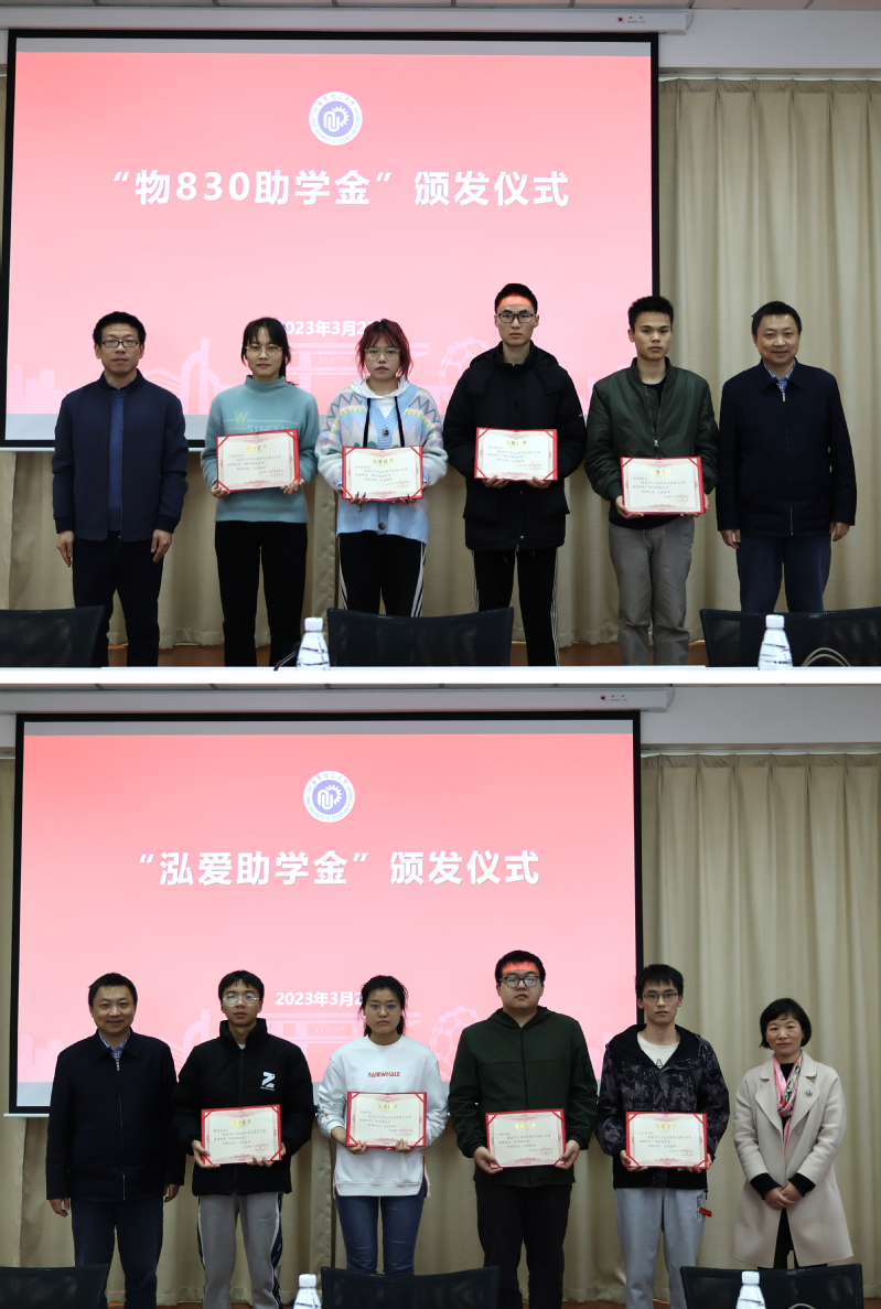李剑与钮月萍、郑致刚共同为获得2022年度“鸿爱助学金”“物830助学金”的同学颁发了证书。