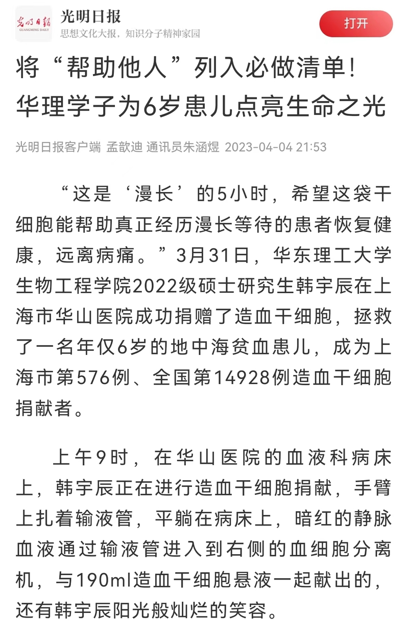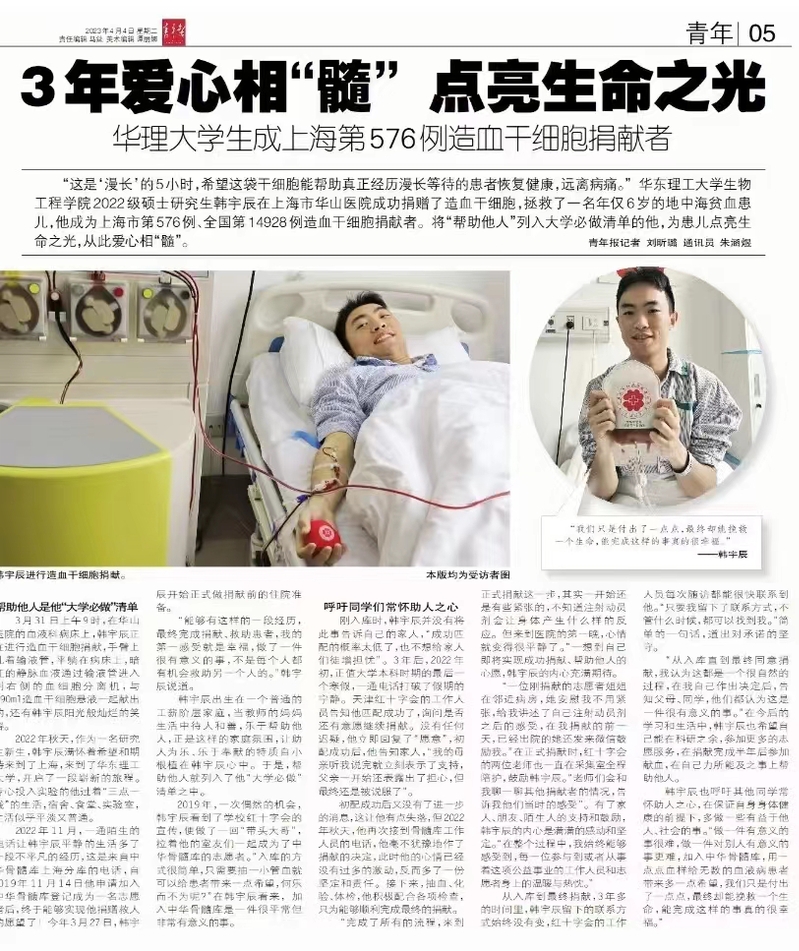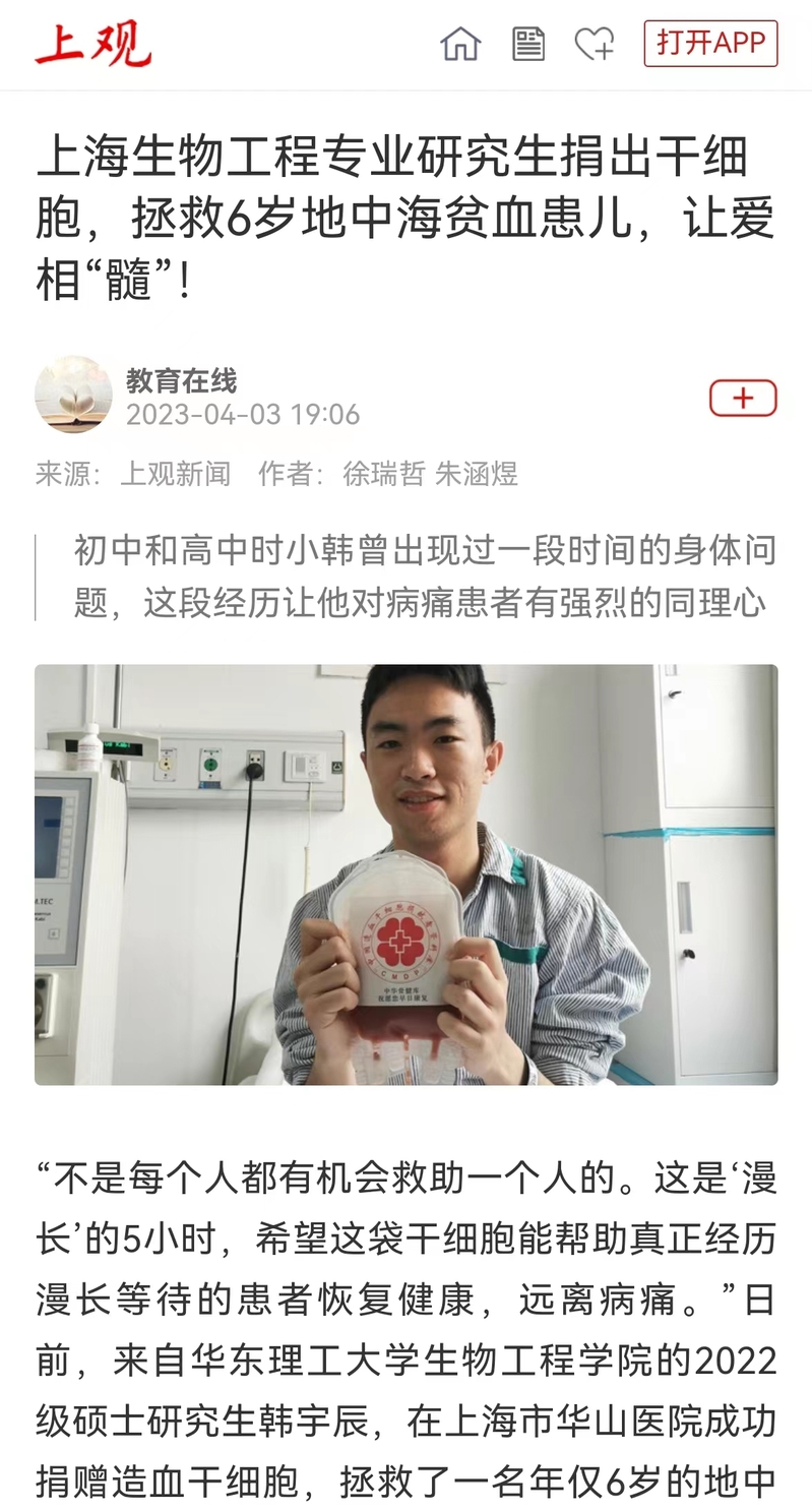 3月31日,完美官方在线入口生物工程学院2022级硕士研究生韩宇辰在上海市华山医院成功捐赠了造血干细胞,拯救了一名年仅6岁的地中海贫血患儿,成为上海市第576例、全国第14928例造血干细胞捐献者。人民日报客户端、光明日报客户端、上观新闻、文汇APP、青年报、新民晚报客户端、东方网、上海科技报、第一教育、话匣子、新民周刊等10余家媒体对相关情况进行了原发报道,本篇选取部分报道予以转载。