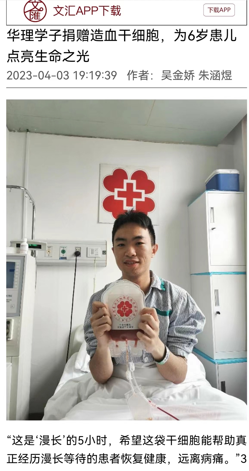 【文汇APP】华理学子捐赠造血干细胞,为6岁患儿点亮生命之光