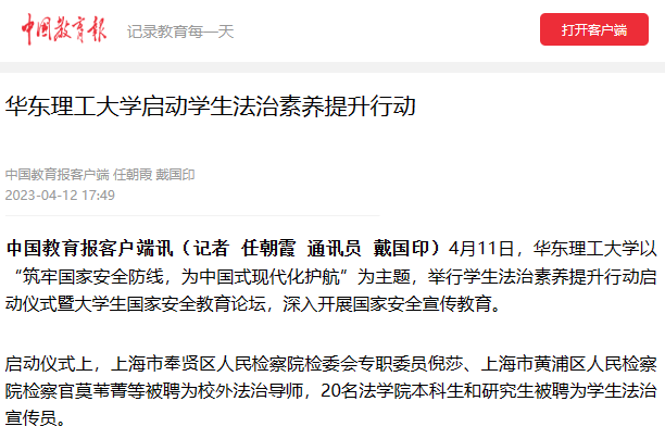 以案普法,以案释法。当天,学生法治素养提升行动在校启动,华理法学院法学203班本科生马原等20人被聘为学生法治宣传员。据悉,这项行动结合大学生学习生活特点,梳理违法违纪风险点,选取大学生典型案例编写《学生法治教育案例汇编》,通过讲座报告、主题论坛、学术研究、座谈分享等形式开展涉国家安全法律法规宣传教育,综合运用网站、微信公众号等媒体平台开设“法律小课堂”等网络法治教育栏目。