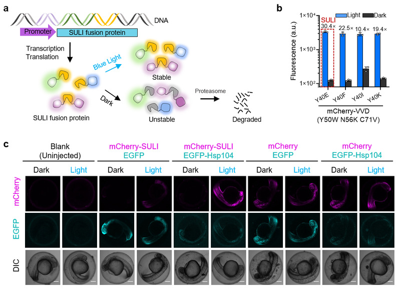在本研究中,研究团队基于光敏蛋白VVD发展了光诱导稳定的蛋白质降解标签SULI(stabilization upon light induction)。在黑暗条件下,SULI标签会被细胞的降解系统识别并降解;在蓝光照射下,SULI标签则非常稳定。实验结果表明,SULI可被用于调控多种报告蛋白的稳定性。更重要的是,SULI可插入在目的蛋白的N端、C端甚至是内部来调控它们的稳定性。进一步研究结果表明,SULI对目的蛋白的降解是光强依赖的,并且可以震荡式调控目的蛋白在细胞中的丰度。本研究还研究了SULI介导蛋白质降解的分子机制。结果表明,SULI是通过非赖氨酸泛素化依赖的蛋白酶体途径降解的,并且还伴随有聚集与去聚集过程。研究团队利用显微成像实验证明SULI在其降解过程中会发生聚集,并在Hsp104蛋白的辅助下完成去聚集并进入蛋白酶体完成降解过程。本研究随后利用SULI调控酵母细胞内源蛋白SicI的稳定性,实现酵母细胞周期的精确控制。此外,SULI还可用于调控斑马鱼中蛋白质的稳定性,通过对Pitx2蛋白稳定性的调控,本研究实现了斑马鱼发育过程的精确控制。综上,SULI为研究不同细胞过程中的蛋白质代谢和功能提供了一个强大而方便的工具。