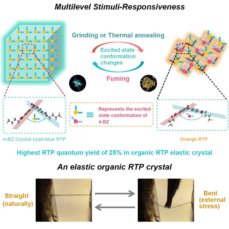 结晶诱导磷光已经被证明是一种实现室温磷光发射的有效方法,然而,晶体的易碎性限制了其应用范围。因此,为了避免上述晶体材料的应用缺陷,开发弹性有机室温磷光晶体是至关重要的。目前,弹性有机晶体材料一般是不发光或者是只具有荧光发射的,这限制了其某些特定的应用场景。据我们所知,只有少数几个例子报道了晶体材料兼具室温磷光发射与弹性的性质。此外,由于刺激响应性发光材料可以快速地对外界的刺激(如:力、热、PH、溶剂等)做出响应,从而成为近年来研究的热点之一。将刺激响应性与弹性室温磷光晶体相结合无疑可以提高纯有机室温磷光材料的应用潜力,但由于三线态对外界环境的敏感性,所以想要使晶体材料同时兼具室温磷光发射、刺激响应性和弹性无疑是十分困难的。迄今为止,在光学材料领域还没有报道具有多级刺激响应性的弹性有机室温磷光晶体。