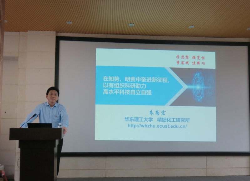 最后,副校长朱为宏为学院师生党员上“在知势、明责中奋进新征程,以有组织科研助力高水平科技自立自强”专题党课。朱校长结合学校“十四五”科研布局和科研初心,从“深刻认识高校科技创新面临的形势、准确把握高校科技创新的使命任务、以有组织科研推动高校科技创新突破”三个方面向大家分享了学习贯彻习近平新时代中国特色社会主义思想主题教育学习体会。他强调,作为高校科技战线一员,要认真领会党中央、国务院和教育部作出的战略部署与安排,深刻认识高校科技创新面临的形势,准确把握高校科技创新的使命任务,以有组织科研引领高校科技创新工作,为中国式现代化建设奠定坚实的科技支撑。
