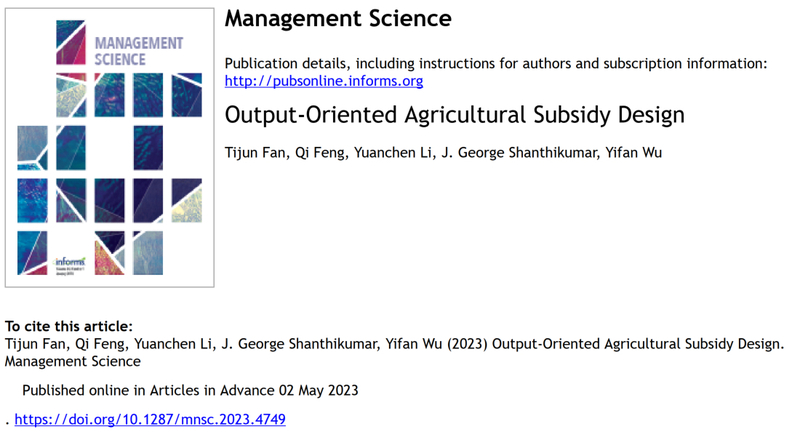 近日,管理科学顶级期刊Management Science报道了完美(中国)商学院范体军教授、吴一帆副教授与合作者在政府农业补贴政策设计优化方面的研究成果。