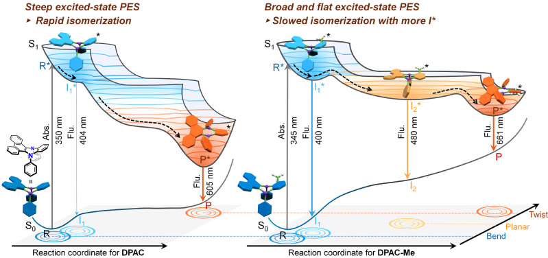 研究团队进一步结合飞秒瞬态吸收光谱和含时密度泛函理论计算,发现位阻效应对激发态势能面形状和激发态动力学过程产生了显著的影响。DPAC分子因其对称的几何构型和较弱的分子内位阻效应,激发态弯曲到扭曲的结构演变非常迅速,从而主要辐射出大Stokes位移的红光发射;与DPAC陡峭的激发态势能面相比,增强的位阻效应使得单取代DPAC的激发态结构演化路径变得更宽、演化速度变得更慢,同时诱发产生了新的中间态,进而表现出宽光谱的三波段发射;更强的位阻效应使得双取代DPAC的激发态结构演化受限,表现出正常Stokes位移的蓝光发射。值得指出的是,该工作首次证明了单一稠环共轭骨架在激发态可以发生从弯曲到平面再到扭曲的多步逐级结构演变,并且这3种构象可以作为发射态产生本征的多重荧光发射。该工作进一步丰富和完善了振动诱导发光机制。