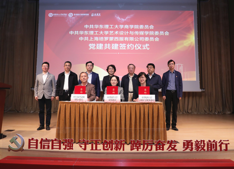 图片说明:商学院党委、艺术学院党委与培罗蒙党委共同签署党建共建协议