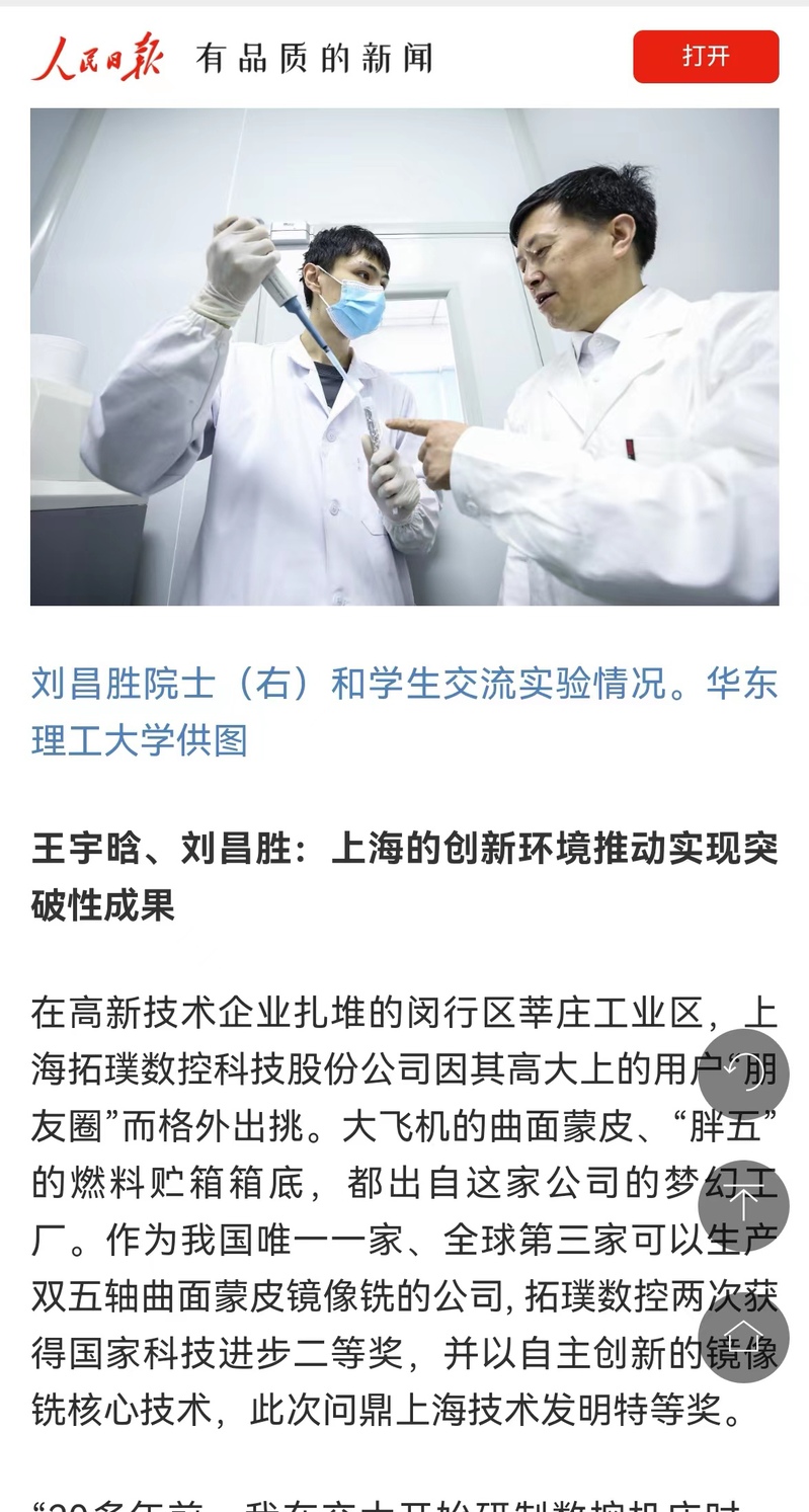 在高新技术企业扎堆的闵行区莘庄工业区,上海拓璞数控科技股份公司因其高大上的用户“朋友圈”而格外出挑。大飞机的曲面蒙皮、“胖五”的燃料贮箱箱底,都出自这家公司的梦幻工厂。作为我国唯一一家、全球第三家可以生产双五轴曲面蒙皮镜像铣的公司, 拓璞数控两次获得国家科技进步二等奖,并以自主创新的镜像铣核心技术,此次问鼎上海技术发明特等奖。