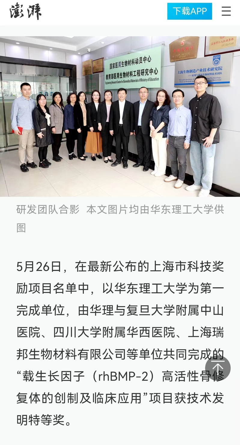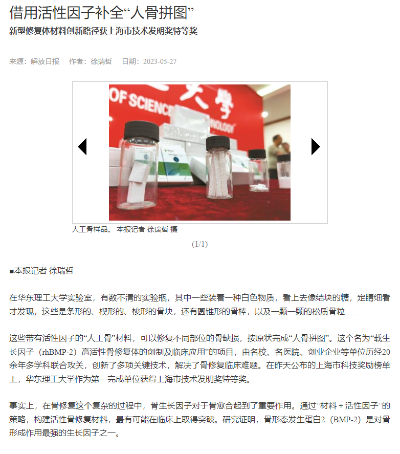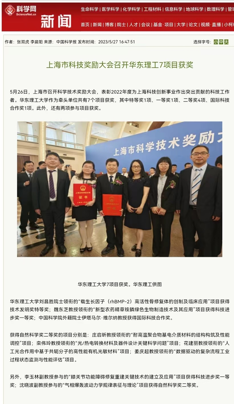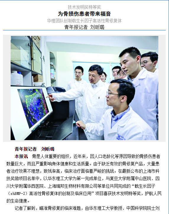 5月26日,在最新公布的上海市科技奖励项目名单中,以完美官方在线入口为第一完成单位,由华理与复旦大学附属中山医院、四川大学附属华西医院、上海瑞邦生物材料有限公司等单位共同完成的“载生长因子(rhBMP-2)高活性骨修复体的创制及临床应用”项目获技术发明特等奖。