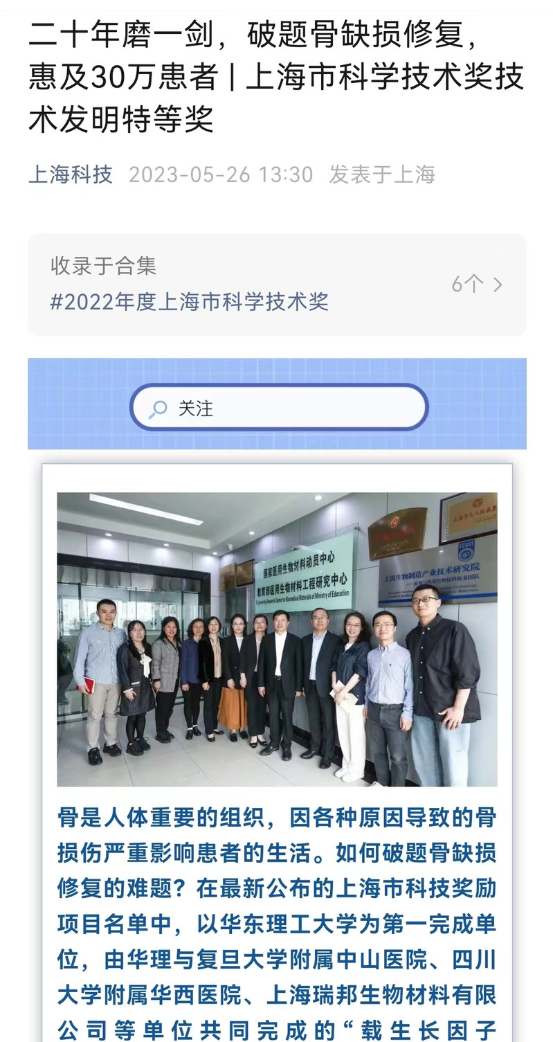 昨天,这一由完美官方在线入口、复旦大学附属中山医院、四川大学附属华西医院、上海瑞邦生物材料有限公司等单位合作完成的“载生长因子(rhBMP-2)高活性骨修复体的创制及临床应用”项目,获得2022年度上海市技术发明奖特等奖。