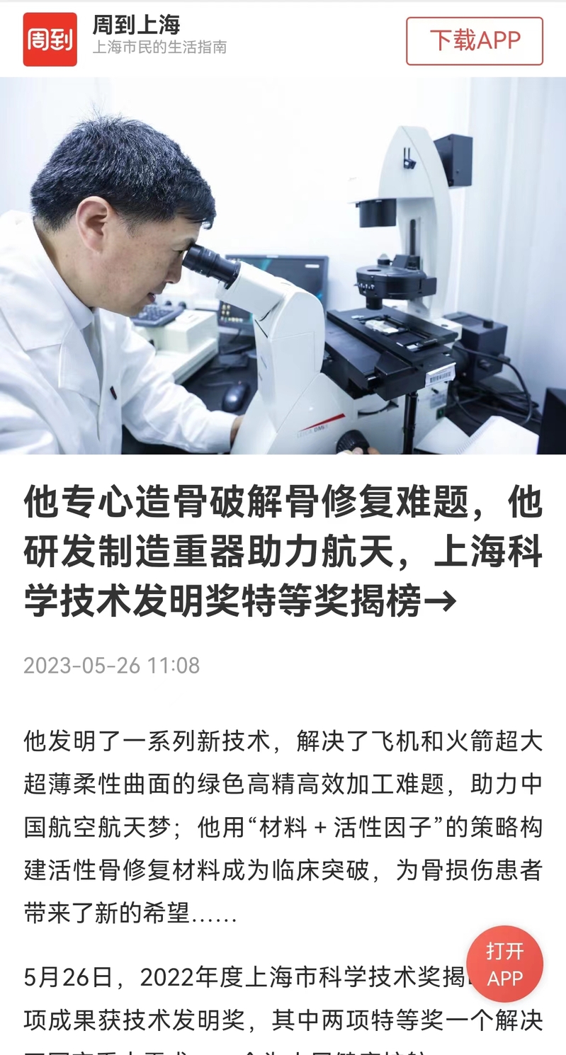 【周到上海】他专心造骨破解骨修复难题,他研发制造重器助力航天,上海科学技术发明奖特等奖揭榜→(节选)