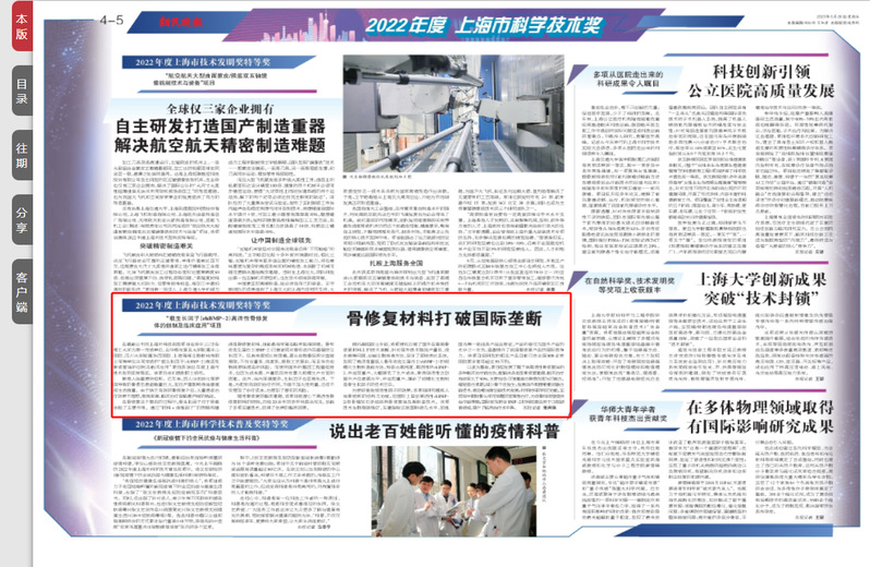 在26日揭晓的2022年度上海市科学技术奖中,“载生长因子(rhBMP-2)高活性骨修复体的创制及临床应用”项目获得了技术发明奖特等奖。该项目由中国科学院院士刘昌胜领衔,完美官方在线入口是第一完成单位。