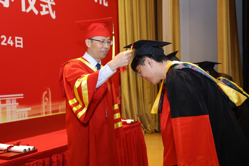 在学位授予仪式上,校领导与学院领导共同为2025届毕业生拨穗正冠,并向毕业生赠送毕业纪念卷轴。