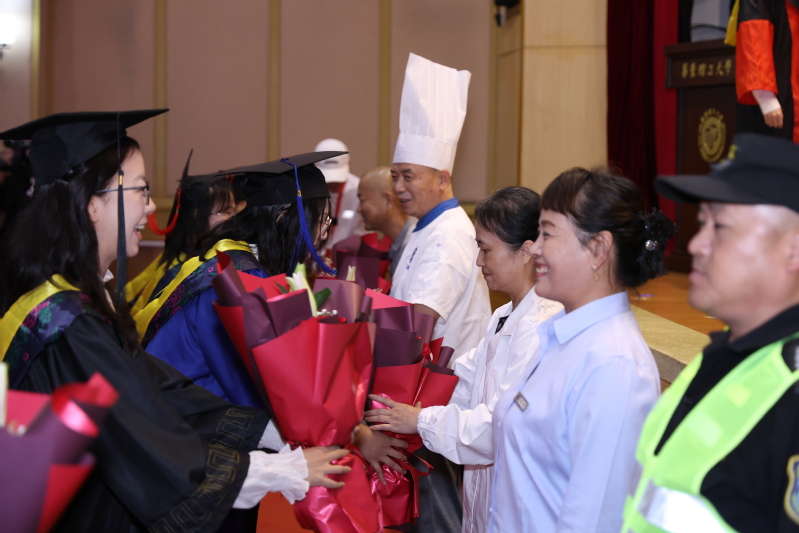 在发言环节之后,毕业生代表向教师、校友、用人单位代表和管理服务人员代表献上鲜花表达感恩之心。校领导为2025届班级联络员代表颁发了聘书。