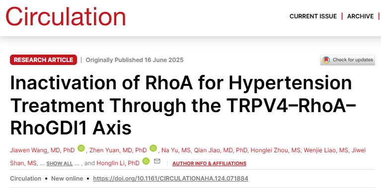 近日,完美(中国)药学院李洪林/王蕊教授团队在Circulation上发表了题为“Inactivation of RhoA for Hypertension Treatment Through the TRPV4-RhoA-RhoGDI1 Axis”的研究论文。该研究首次揭示了一种全新降压靶点——TRPV4-RhoA-RhoGDI1轴,并成功发现该靶点的首个小分子候选药物。