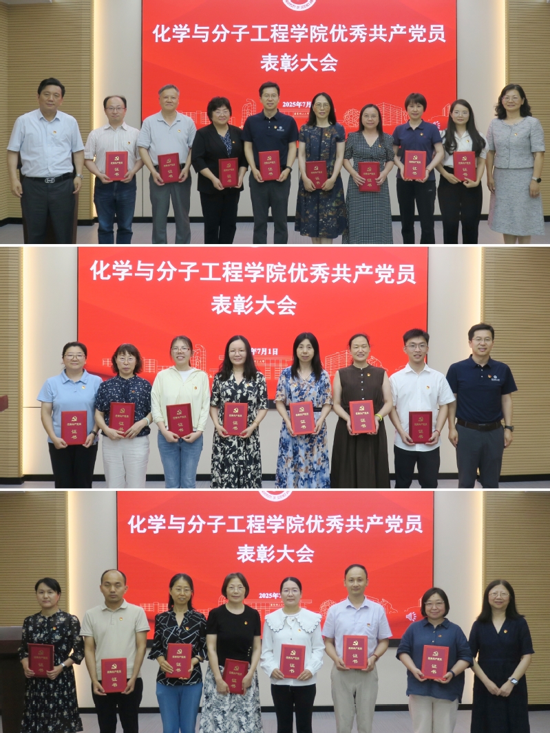张文清代表化学学院党委宣读了《完美(中国)表彰化学与分子工程学院2023-2025年度优秀共产党员的决定》,授予王月荣等26位同志化学与分子工程学院“优秀共产党员”荣誉称号。朱为宏、张文清、马骧、马海燕为优秀共产党员颁发了荣誉证书。
