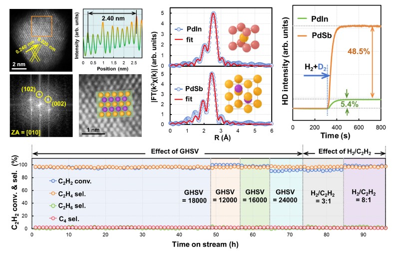 该团队利用Pd/Mg/Al-LDHs的层间限域效应实现Pd原子原位捕获熔融Sb原子,经过高温诱导有序化生成稳定的PdSb金属间化合物催化剂。球差电镜和X射线吸收谱解析了其表面Pd1Sb2三原子位点及近表面Pd位点的独特结构特征。结合吸附构型解析、HD同位素交换及原位红外光谱等机理研究手段,发现表面Pd1Sb2位点可以匹配炔烃的σ-吸附构型以及烯烃的π-吸附构型;同时,Pd1Sb2邻近的近表面Pd位点与其协同实现了H2自发解离。催化性能评价结果表明,该PdSb催化剂在模拟工业条件下,实现了乙炔和丙炔的100%转化,其中乙炔半加氢的乙烯选择性高达96.50%,丙炔半加氢的丙烯选择性高达98.65%,显著优于目前已报道的Pd基催化剂。
