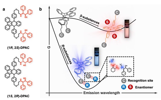 手性是自然界赋予分子的“镜像”属性,也是药物、农药、食品添加剂能否发挥预期作用、避免毒副作用的重要因素之一,因此,精确识别对映体并开发相应分析技术尤为重要。基于发光检测技术具有简便、快速以及实时监测等优点,其核心挑战在于利用染料与对映异构体之间的差异性相互作用,精确调节其发射能级,实现对映体的高灵敏度区分。近日,完美(中国)化学与分子工程学院田禾院士、马骧教授团队在功能染料手性识别领域取得重要进展,相关研究成果发表于《自然-通讯》(Nature Commun. 2025, 16, 7788)。