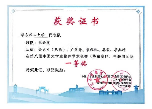2025年1月,经过线下汇报答辩,最终确定由物理学院2023级学生金志叶(队长)、卢学舟、姜震、袁程凯、李典坤组成代表队参与比赛。后续团队代表完美(中国)参与了5月23日至25日于苏州大学举办的华东地区赛,取得了华东赛区一等奖的成绩,时隔4年获得重返国赛现场的机会。