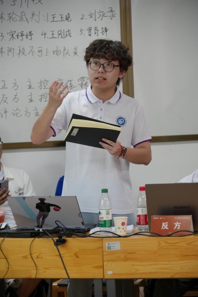 国赛现场上,袁程凯同学作为反方主控队员进行讨论