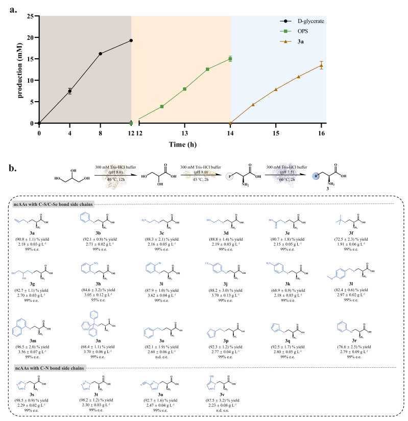 非天然氨基酸(non-canonical amino acids, ncAAs)因其结构多样与功能独特,广泛应用于药物发现、蛋白质工程和功能材料开发。然而,传统单酶合成方法普遍存在成本高、效率低等问题,难以满足绿色制造的产业需求。针对上述瓶颈,李志敏教授团队提出以甘油为起点、以水为唯一副产物的ncAAs绿色合成策略,构建了一个模块化多酶级联体系,系统实现了从廉价生物质向高值功能分子的转化。该体系包括三个协同模块:模块I利用高效醇氧化酶将甘油氧化为甘油酸;模块II借助一系列辅助酶与能量再生系统,实现甘油酸向关键中间体O-磷酸-L-丝氨酸的高效转化;模块III以具有底物多样性与高催化效率的OPSS酶为核心,结合“插拔式”反应策略,成功制备22种具有C–S、C–Se和C–N侧链的ncAAs,产率最高达98.5%,原子经济性超过75%,且具备高度立体专一性,已实现克级至十克级规模放大。