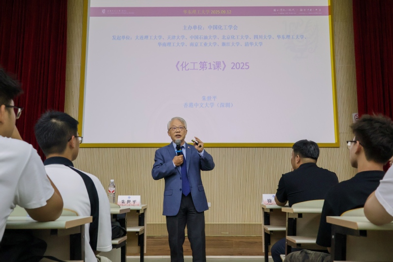 9月12日,化工学院2025级新生“化工第一课”在奉贤校区A200报告厅举行。香港中文大学(深圳)副校长、加拿大工程院院士、加拿大皇家科学院院士、发展中国家科学院院士朱世平教授应邀讲授“化工第一课”,为500余名化工青年开讲启蒙“第一堂课”。化工学院院长徐至主持活动,学院党委副书记兼纪委书记孙莉,教授代表奚桢浩、胡静,学院党政办副主任费妮娜,辅导员及全体2025级本科生参加了本次活动。